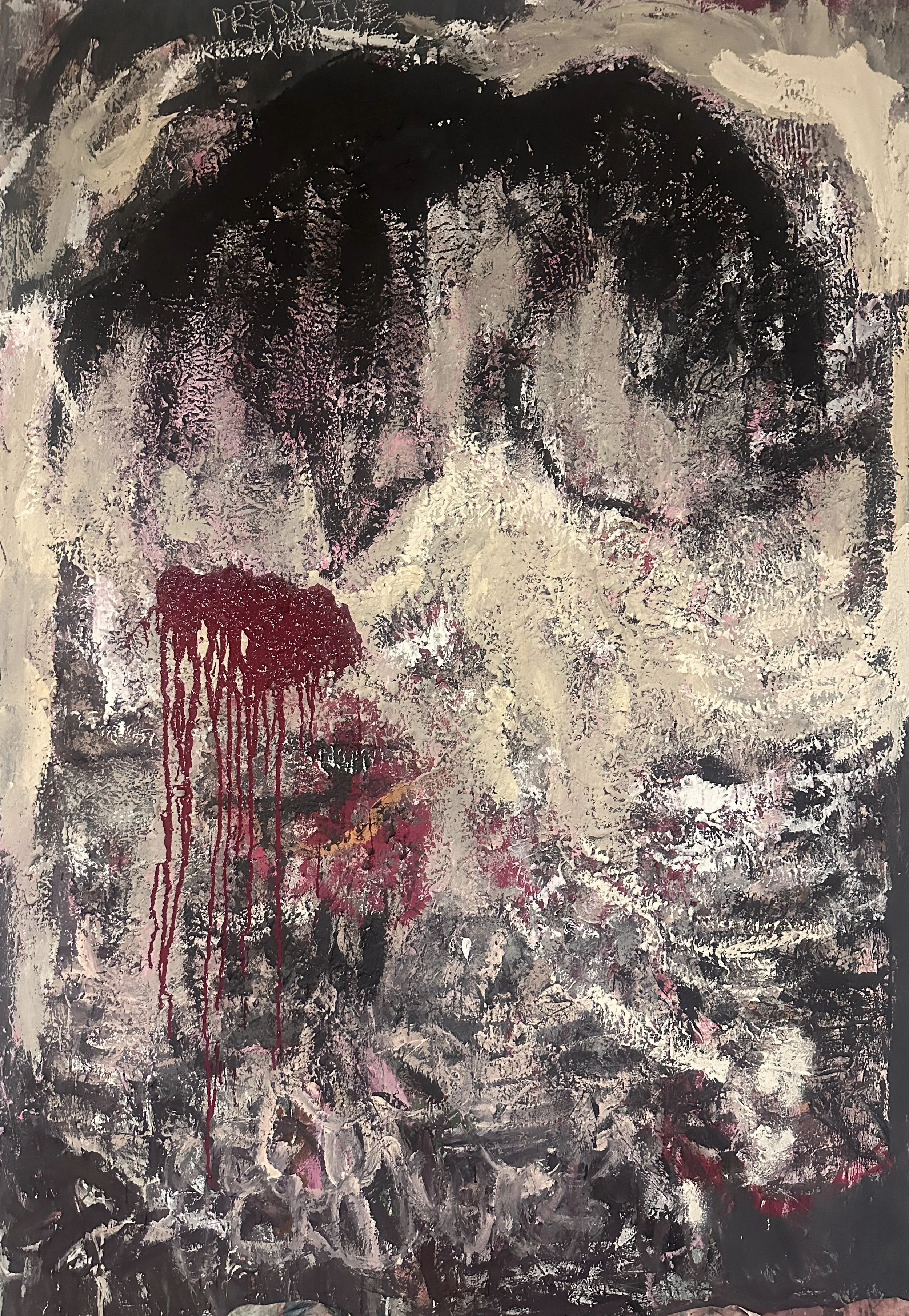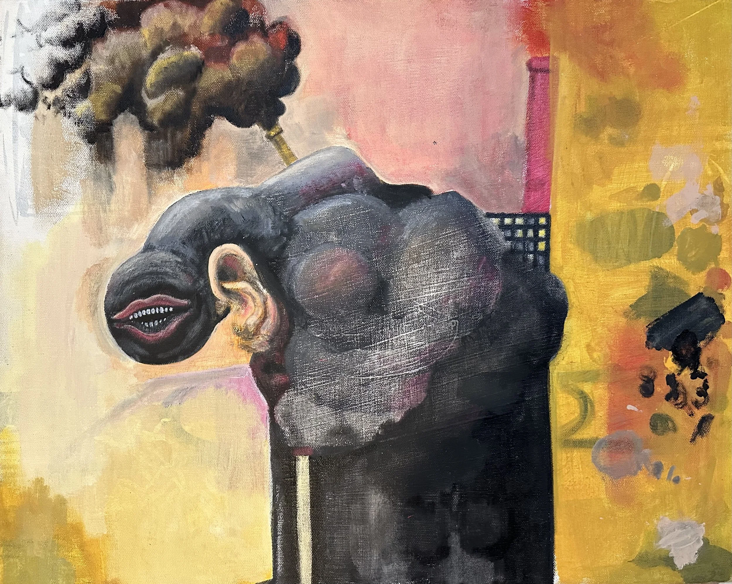 “I simply paint the current state of the world. I paint the truth. The looming figures I allude to within my works, I suppose, are representative of something terrible about to happen. I like to call them “superorganisms”, which means many organisms making up one. It’s an amalgamation, I believe, looming over humanity, perhaps. It could be an allegory for artificial intelligence. Sometimes I paint them with smiles, to represent manipulation, as they claim they will make the world a better place, but all I’ve seen, as most others will agree, is an increase in the disparity of wealth and the mass takeover of jobs, and the destruction of culture.”